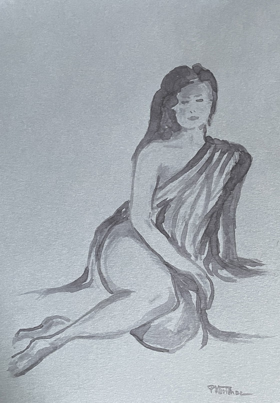 Aquarelle Monochrome sur Papier Denim - Portrait Féminin