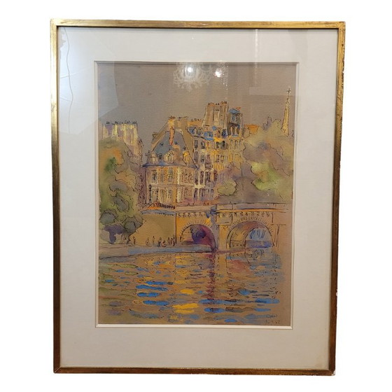 Image 1 of Aquarelle sur papier « Pont Marie, Paris », post-impressionnisme, signée Gilis, 1962 - France