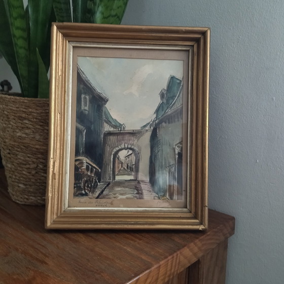 Découvrez cette aquarelle captivante de l'artiste primé Martin, représentant une scène pittoresque de la Rue du Président à Namur. Cette œuvre originale, réalisée avec une technique mixte alliant aquarelle et pastel, capture l'essence d'une ruelle ancienne sous une arche, baignée de lumière naturelle. Signée par l'artiste, elle témoigne de son talent à immortaliser des scènes urbaines avec une sensibilité unique.