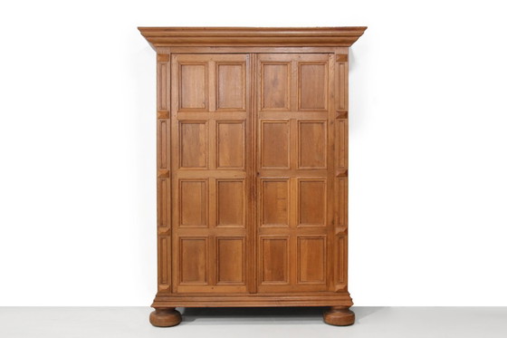 - Fabriquée en chêne noble, cette armoire met en valeur le motif complexe des panneaux, caractéristique de l'époque, alliant durabilité et esthétique.