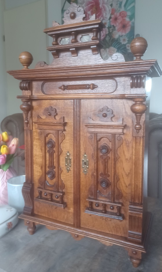 Découvrez le charme intemporel de cette armoire à pharmacie ancienne de l'époque Gründerzeit, un chef-d'œuvre d'artisanat et d'élégance. Fabriquée en Allemagne entre 1870 et 1890, cette pièce unique est conçue pour être fixée au mur et apporte une touche de charme historique à votre intérieur. Réalisée en chêne sculpté à la main, l'armoire présente une crête imposante et des ferrures d'origine qui soulignent son authenticité. Les éléments finement travaillés témoignent du savoir-faire et du souci du détail caractéristiques du style Gründerzeit. D'une hauteur de 67 cm, cette armoire offre un espace généreux pour exposer vos objets précieux. Apportez une touche d'histoire à votre intérieur avec cette armoire murale unique. Contactez-nous dès aujourd'hui pour plus d'informations.