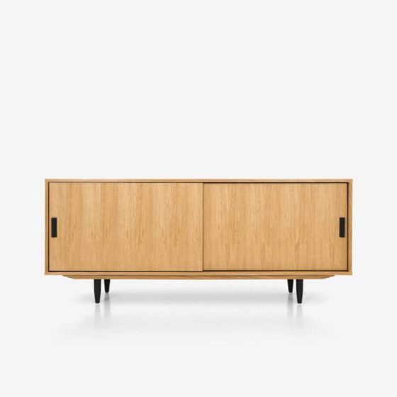 Nous avons équipé ce meuble de deux paires de portes coulissantes, dotées d'un système de fermeture silencieux. Derrière chaque façade se trouve une étagère, dont la position peut être ajustée selon vos besoins.