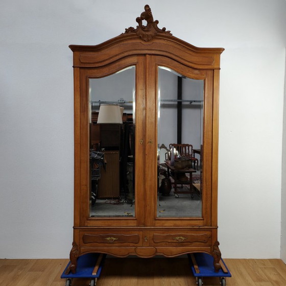 Cette armoire ancienne Louis XV à miroirs apporte instantanément du caractère et une ambiance chaleureuse à votre intérieur. Le chêne massif présente une patine naturelle et met en valeur un magnifique travail du bois artisanal. La crête caractéristique ornée de motifs floraux et les élégants pieds galbés confèrent à ce meuble une allure majestueuse. Deux grandes portes aux panneaux de miroirs d'origine reflètent la lumière et agrandissent visuellement la pièce. Derrière ces portes, l'armoire offre un espace de rangement pratique et généreux : une tringle et deux tiroirs. Les ferrures en cuivre authentiques et les lignes raffinées s'intègrent parfaitement dans un intérieur rustique ou vintage. Cette armoire en chêne démontable allie charme historique et robustesse. Optez pour une pièce maîtresse intemporelle qui traversera les générations et créera instantanément une atmosphère luxueuse dans votre chambre. La serrure de l'armoire est hors service, mais elle se ferme correctement. Les miroirs peuvent présenter des traces d'usure.