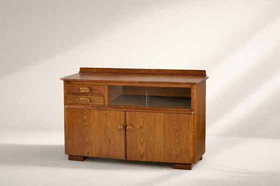 Il combine harmonieusement deux tiroirs, deux portes et des fenêtres en verre.