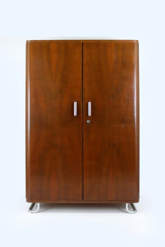 Cette armoire de style Bauhaus a été conçue par Hynek Gottwald et fabriquée en Tchécoslovaquie dans les années 1940. Elle est dotée de deux portes, d'une tringle intérieure et d'une étagère. L'armoire repose sur des pieds chromés et est équipée de poignées cylindriques chromées. Les serrures à clé d'origine ont été remplacées par des serrures magnétiques. Le meuble est resté dans son état d'origine et est en excellent état de conservation.