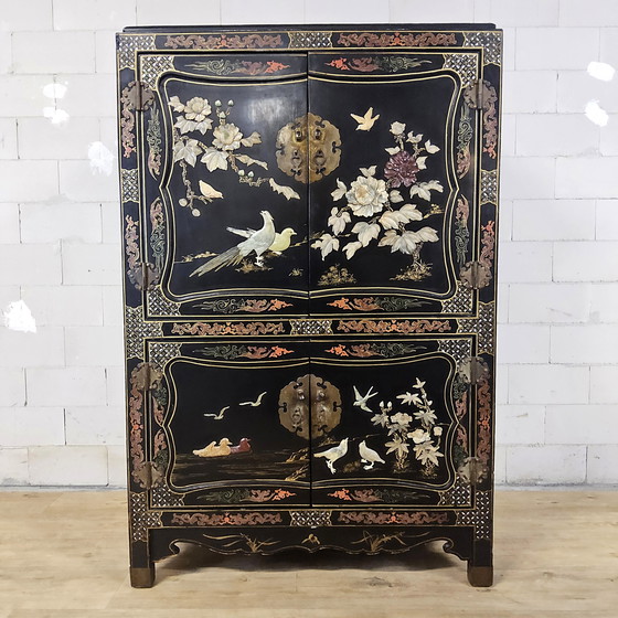 Une armoire orientale unique. Ces armoires datent des années 1970, époque à laquelle on a assisté à un renouveau de la Chinoiserie. Ce style a vu le jour au milieu du 18ème siècle, lorsque des châteaux entiers étaient remplis de meubles et d'objets chinois et orientaux. C'est donc dans les années 1970 que ce type de meubles a été créé et aucun n'est identique. Tous les éléments sont posés à la main, ce qui leur confère toujours une touche artistique.