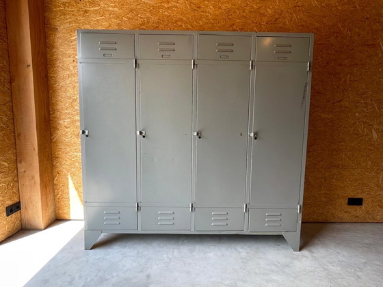 Armoire de rangement industrielle en métal à quatre portes séparées. Finition gris clair, style robuste et minimaliste. Chaque casier conserve son porte-manteau d'origine avec quelques crochets. Les étagères blanches sont facilement amovibles. Nous l'utilisions comme bibliothèque.