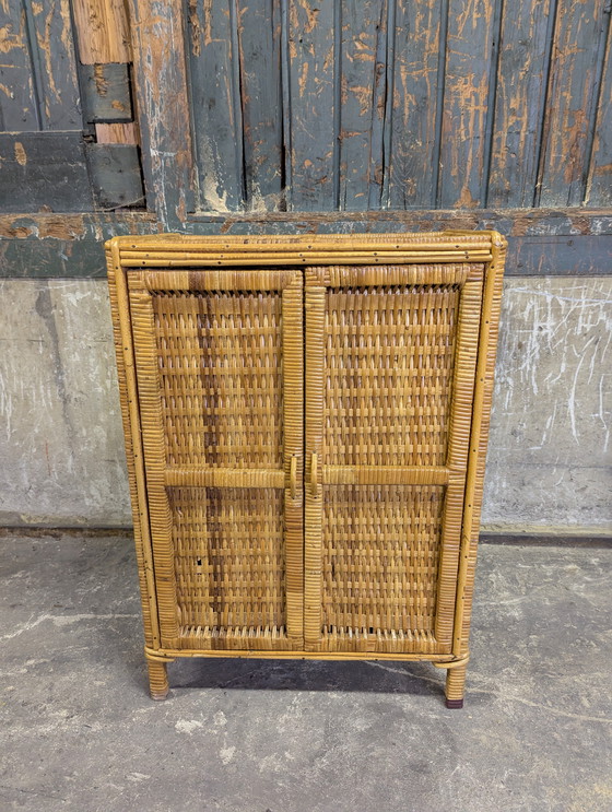 Meuble de rangement vintage en rotin des années 1970, modèle compact.