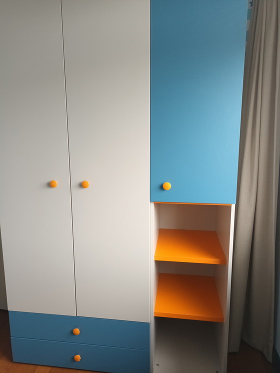 En très bon état, pratiquement aucune marque d'utilisation. Acheté chez Scanmobel, chambres d'adolescents pour enfants. Dimensions : H221XB135XP60,5 cm : H221XB135XP60,5 cm, en couleurs canapa (gris), mirtillo (bleu), carota (orange). Beaucoup d'espace de rangement et une très belle armoire. S'en va pour cause de changement de chambre d'enfant. Prix original 1256,- Je suis heureux de le vendre à sa valeur.