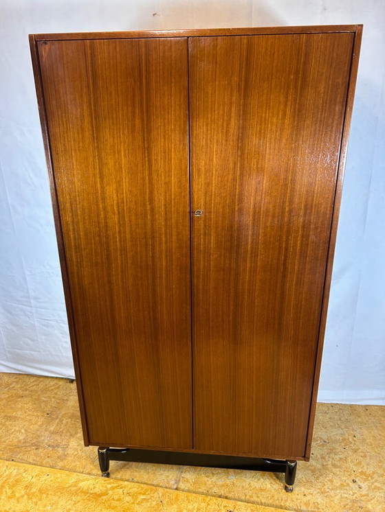 Armoire en teck vintage rétro du milieu du siècle par G Plan (E. Gomme) – Gamme Librenza, années 1950. Superbe et rare exemple de design britannique du milieu du siècle avec une touche italienne audacieuse, cette armoire G Plan de la très recherchée gamme Librenza (conçue par E. Gomme dans les années 1950) est une véritable icône du design. Fabriquée en bois de teck aux tons riches avec des placages magnifiquement veinés. Des pieds noircis saisissants avec des pieds et des détails en laiton, reflétant l'influence du design italien qui a défini la collection Librenza. Des lignes épurées et modernistes associées à des finitions luxueuses — une pièce élégante qui sublime n'importe quelle chambre. L'intérieur aménagé offre un rangement pratique, notamment une tringle à vêtements, des étagères internes et des compartiments pour un séjour organisé. Produite par E. Gomme Ltd., G Plan est devenue un symbole de la vie moderne dans la Grande-Bretagne d'après-guerre. Lancée dans les années 1950, la gamme Librenza répondait à l'essor du design européen, et notamment italien, en associant des finitions noires audacieuses à des tons bois riches et des touches de laiton. Ces pièces, à la pointe de la technologie à l'époque, restent aujourd'hui très prisées des collectionneurs pour leur allure sophistiquée et leur charme intemporel. Apportez une touche de luxe du milieu du siècle et une touche d'histoire du design à votre intérieur avec cette exceptionnelle armoire G Plan. Soigneusement entretenue, elle présente de légers signes d'usure, ce qui renforce son charme vintage. L 91 cm x P 55 cm x H 171 cm