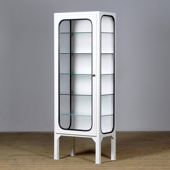 Armoire médicale vintage des années 1970, fabriquée en Hongrie. Cette armoire pleine de caractère est réalisée en fer et en verre, ce dernier étant fixé à l'acier par un joint en caoutchouc. Son design épuré et intemporel s'intègre parfaitement dans un intérieur industriel, moderne ou vintage. Équipée d'une serrure et d'une clé en parfait état de fonctionnement, elle est idéale pour ranger vaisselle, objets de collection ou pièces design. L'armoire comprend cinq étagères en verre réglables, permettant une personnalisation aisée de l'agencement. Un objet unique et fonctionnel au charme vintage authentique.