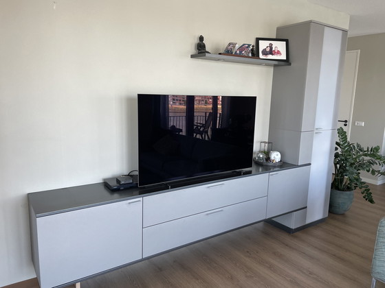 Armoire Interstar avec éclairage dans les armoires et les étagères. Acheté en 2008. Les couleurs sont Alu Ral 9006 Structured et Brilliant Graphite. Sur les armoires hautes, les portes sont en partie en verre de lait et il y a des supports en verre dans l'armoire.