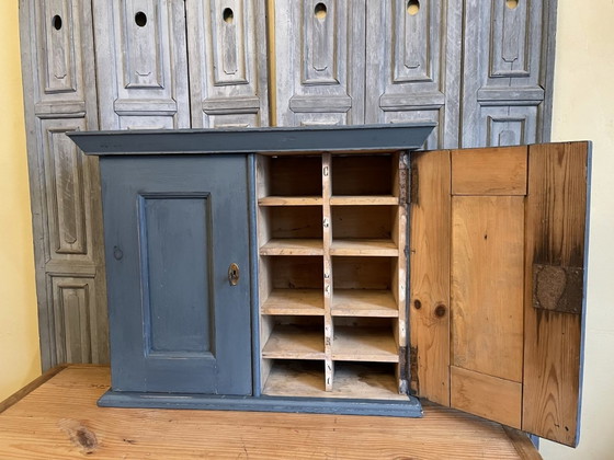 Une très belle armoire, également en couleur, provenant de France. Vous pouvez la suspendre ou la poser quelque part. L'armoire a 20 compartiments. Très joli pour votre collection. Dans l'une des portes, la serrure est à l'envers, pour que vous ne buviez pas trop, mais la serrure est juste comme ça. Largeur : 63,5 cm. Profondeur : 23 cm. Hauteur : 51 cm. Compartiments : 12 en largeur - 8 en hauteur - 16 en profondeur.