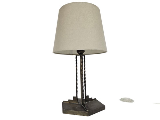 Lampe de table brutaliste, un style populaire dans les années 1930 à 1950. Cette lampe présente un pied caractéristique en bronze/cuivre forgé, avec une base hexagonale géométrique et des tiges verticales torsadées. Le câblage électrique a été refait, testé et est en parfait état de fonctionnement.