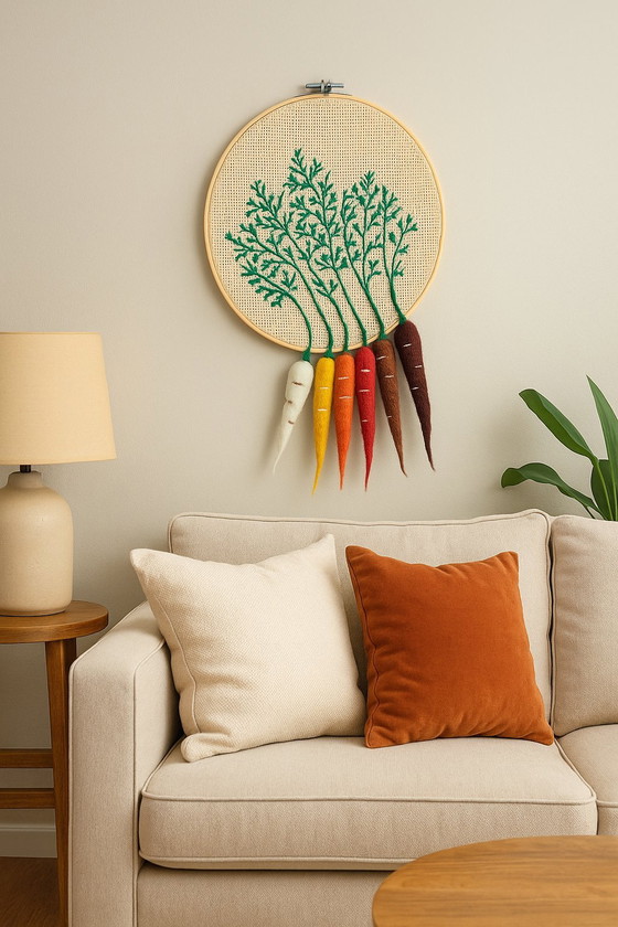 Apportez un charme ludique et artistique à votre espace avec ce cercle de broderie fait à la main représentant une grappe de carottes vibrantes dans des tons arc-en-ciel. La verdure est brodée en fil vert riche sur une toile de jute rustique, tandis que chaque carotte est sculptée dans de la laine égyptienne douce et feutrée à la main pour un effet 3D. Parfait pour les cuisines, les crèches ou les espaces créatifs.