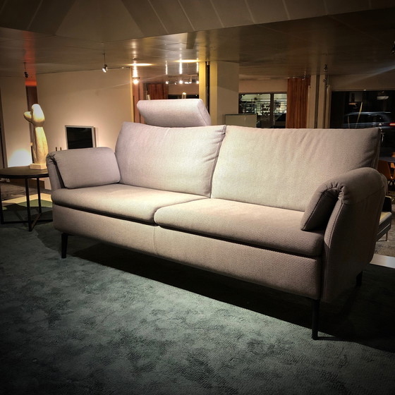 Canapé 2,5 places Artanova Spiez Relax, 192 cm de hauteur, revêtu du tissu L4116 gris/taupe. Les accoudoirs peuvent être relevés pour un soutien lombaire optimal, ou vous pouvez vous allonger en tailleur. Un repose-pieds dépliable est situé à gauche, et l'appui-tête est réversible. Le coussin d'assise moelleux offre un confort exceptionnel.