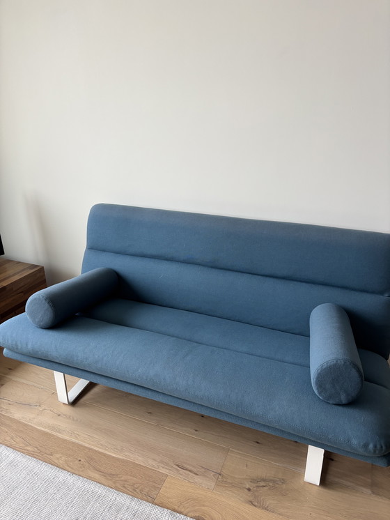Magnifique canapé vintage, ayant appartenu à mes grands-parents qui en ont toujours pris grand soin. Revêtement bleu et pieds blancs.