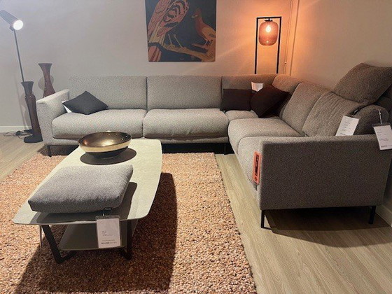 Canapé d'angle Freistil ASO 141 avec un coussin de dossier supplémentaire, revêtu du tissu 4080 noir-blanc-gris. Hauteur d'assise : environ 46 cm, profondeur d'assise : 59 cm, assise de type lounge confort. Largeur : 285 cm, longueur : 225 cm.