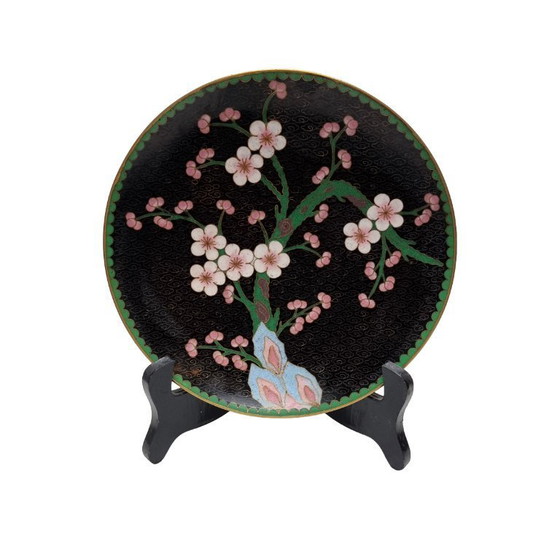 Assiette cloisonnée vintage unique, fabriquée en Chine dans les années 1970/80. Le recto présente une délicate fleur de cerisier sur fond noir et le verso d'un vert éclatant. Décorative et en bon état. Une pièce unique et pleine de caractère, idéale pour décorer un mur ou une pièce de collection.
