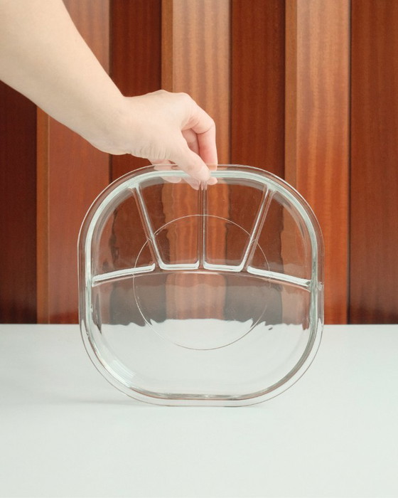 Apportez une touche d'élégance italienne à votre table avec ces assiettes Arno, conçues par le designer italien Joe Colombo pour Italora dans les années 1960. Fabriquées en verre transparent pressé, chaque assiette illustre l'approche géométrique et modulaire caractéristique de Colombo, alliant formes ludiques et fonctionnalité. Leur disposition compartimentée les rend idéales pour servir amuse-bouches, antipasti, desserts ou autres bouchées avec raffinement et praticité.