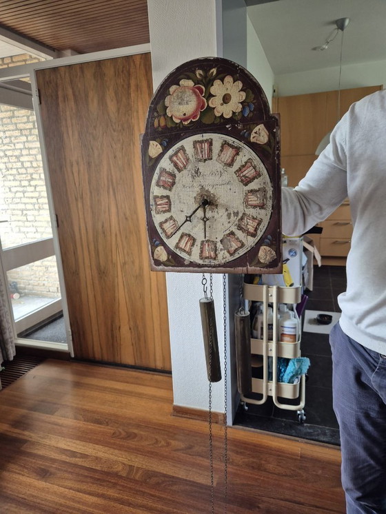 Authentique horloge de chaise frisonne – peinte à la main, XIXe siècle, avec poids
