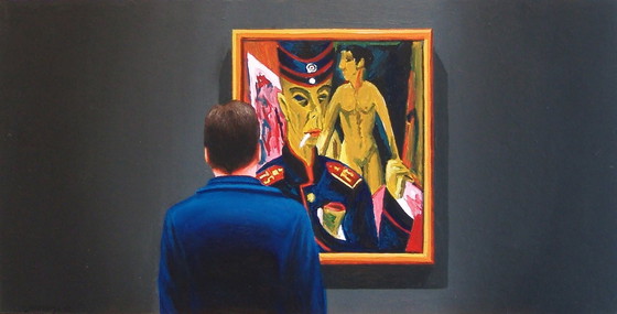 Cette œuvre de 60 x 30 cm représente l'artiste lui-même regardant un autoportrait en soldat d'Ernst Ludwig Kirchner.