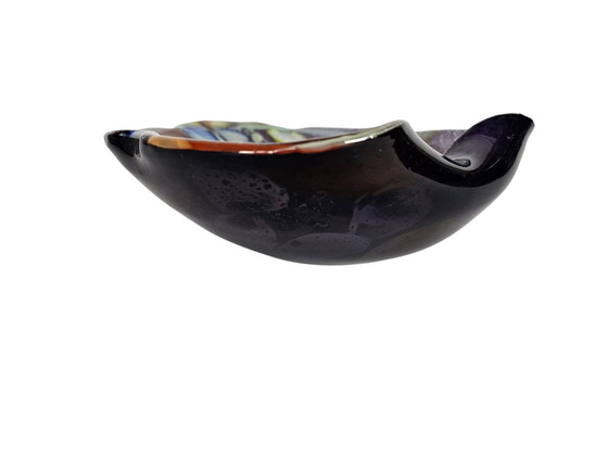 Bol - Cendrier par Arte Vetraria Muranese (AVeM) de Murano. L'intérieur du bol présente une diversité de couleurs caractéristique du verre tutti frutti, l'extérieur du bol est violet foncé.