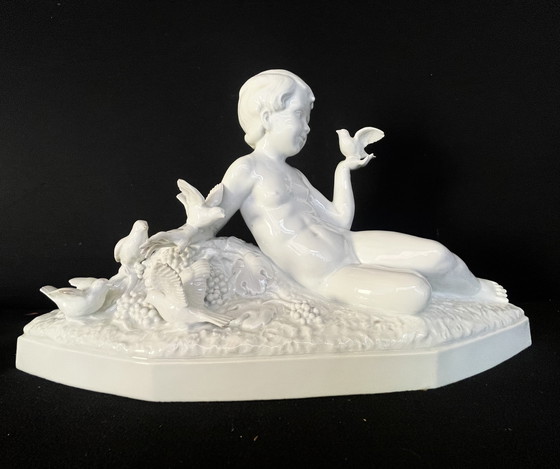 Cette exquise sculpture en porcelaine, « Bacchus aux colombes », réalisée par Réal entre 1899 et 1965, témoigne d'une élégance intemporelle et d'une maîtrise artistique remarquable. Elle représente une scène sereine de Bacchus, le dieu romain du vin, accompagné de colombes, symbole de paix et d'harmonie.