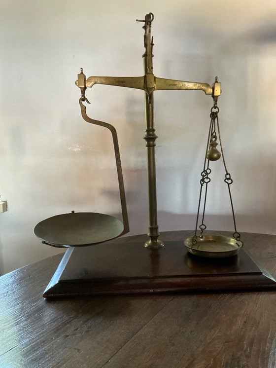Balance d'atelier en cuivre sur socle en acajou massif.