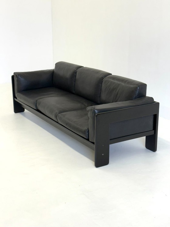 Conçu par Afra et Tobia Scarpa pour Gavina dans les années 1960, ce canapé 3 places Bastiano iconique allie un design italien élégant à un confort optimal. Le canapé a un cadre en bois massif laqué noir et est recouvert de cuir noir, offrant un contraste élégant et un look intemporel. La structure en bois a été entièrement repeinte.