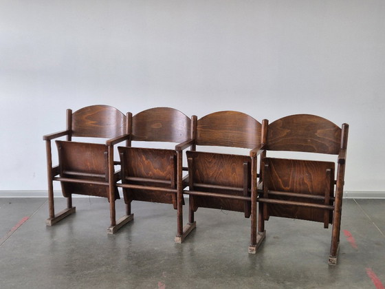 Utilisé à l'origine dans les anciens cinémas, ce banc conserve son caractère authentique avec une patine légèrement vieillie qui rehausse son attrait nostalgique. Les sièges rabattables sont pratiques et la construction en bois massif garantit la durabilité.
