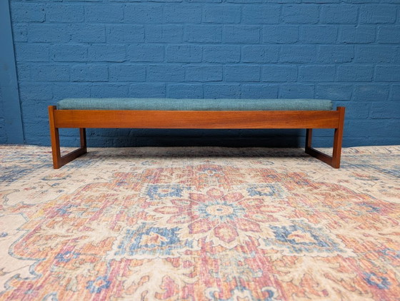 Structure en teck massif avec un coussin d'assise bleu capitonné. Le coussin est muni d'une fermeture éclair. Le banc est en bon état, avec quelques traces d'usage.