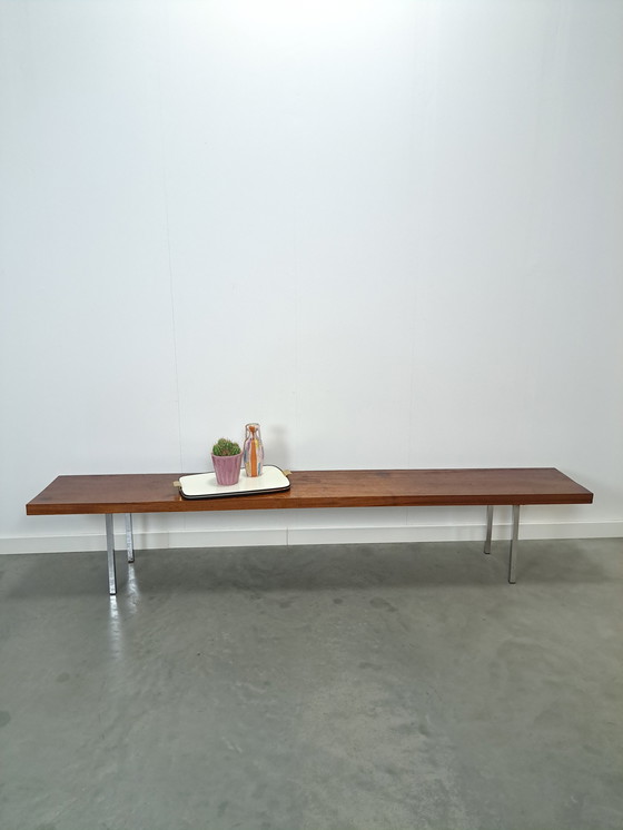 Long banc en bois vintage élégant. Le banc est fabriqué à partir d'une épaisse planche de bois d'acajou massif et possède de magnifiques pieds chromés. Le banc est un véritable accroche-regard à la table à manger, dans le hall d'entrée ou comme meuble TV.