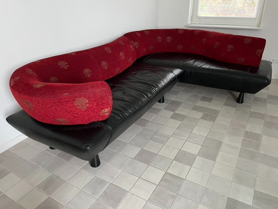 Le canapé Gelderland Boa est une pièce remarquable qui allie avec brio design moderne et confort luxueux. Ce canapé d'angle, signé Gelderland, se distingue par son dossier en textile rouge aux motifs élégants, contrastant harmonieusement avec l'assise en cuir noir épuré.