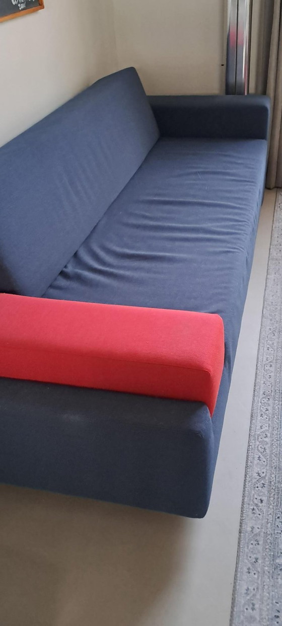 Découvrez ce canapé élégant de la marque « de Vorm ». Parfait pour un intérieur moderne, ce canapé allie confort et design épuré. Son revêtement bleu, rehaussé d'une touche de rouge éclatante, apporte une note ludique à votre salon.