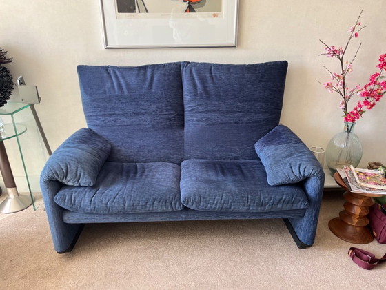 Canapé 2 places Cassina Maralunga, bleu, en bon état, légèrement décoloré sur les accoudoirs. 8 ans. Largeur : 165 cm, profondeur : 81 cm, hauteur d’assise : 38 cm.