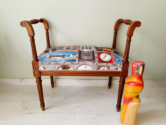 Cette banquette a été retapissée avec un tissu moderne pour lui apporter de la modernité.