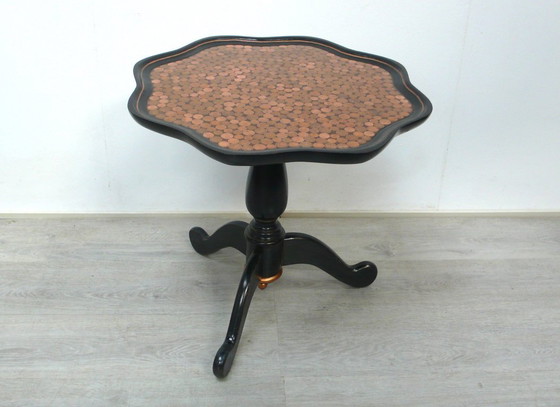 BASE ronde unique en noir + cuivre, avec surface en pièces de monnaie, bois massif Art Nouveau 1930