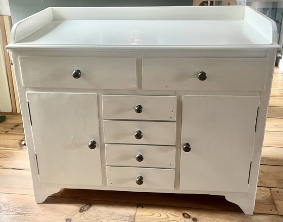 Ces centenaires, elle a appartenu à la même famille pendant de nombreuses années. Sa peinture (à base d'eau, sans danger pour les tout-petits) est superbe et présente de légères traces d'usure, normales pour son âge. Les poignées en bois d'origine des tiroirs sont toujours présentes. Idéale pour décorer la chambre de bébé avec une commode unique et de grande qualité.