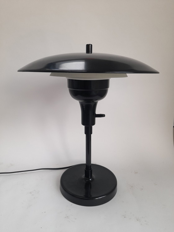 Belle lampe de bureau américaine en métal noir. Pied lourd, qualitatif. Fabricant : Art Speciality. Jolie lumière indirecte diffuse. A noter quelques petits points de rouille à l'intérieur (voir photo). Absolument pas gênant, n'entame pas l'esthétique generrzke de l'objet.