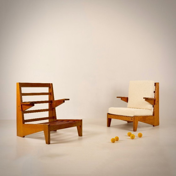 Chêne ciré, mousse et tissu. coussins d’assise et de dossier sur les deux fauteuils (modèle et couleur au choix)