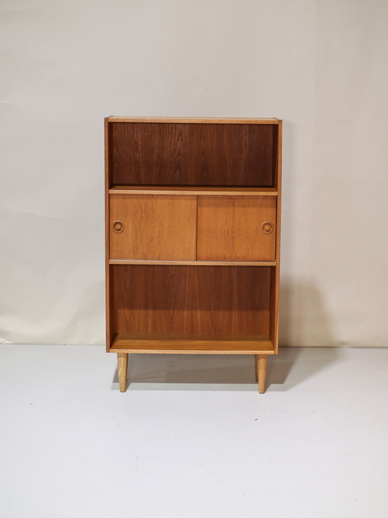 Magnifique bibliothèque vintage du Danemark, années 1960. Cette bibliothèque est fabriquée en chêne chaud et aménagée de manière ludique avec deux compartiments ouverts et une section fermée au milieu. Il y a une étagère blanche derrière les deux portes coulissantes avec de jolies poignées.