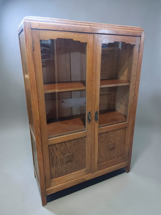 Magnifique bibliothèque Art déco ancienne en chêne. Ce charmant meuble est doté de deux portes vitrées en partie supérieure, offrant un espace d'exposition pour livres ou objets décoratifs. En dessous, deux panneaux pleins permettent de ranger discrètement des objets à dissimuler. Style École d'Amsterdam.