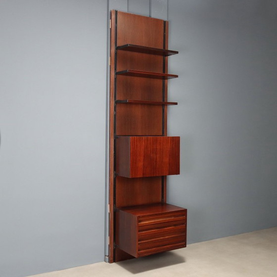 Bibliothèque murale à fixer au mur, comprenant un compartiment de rangement à panneaux avec abattant et tiroirs ; en placage de bois exotique, montants et supports en métal émaillé. Bon état.