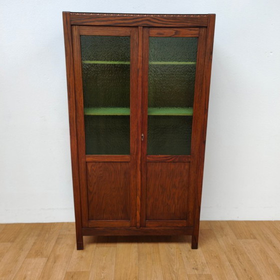 Bibliothèque ancienne. Cette armoire murale vintage est dotée de deux portes vitrées vertes. Derrière ces portes se trouvent trois étagères réglables en hauteur. Cette bibliothèque originale peut également servir de buffet. L'armoire est équipée d'une serrure fonctionnelle.