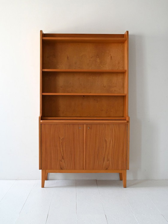 Élégante bibliothèque scandinave vintage en orme clair au veinage apparent. Ses lignes douces et ses bords arrondis lui confèrent un design épuré, fidèle à l'esthétique nordique des années 1950. Le meuble bas comprend deux portes dissimulant quatre tiroirs intérieurs et une étagère. La partie supérieure comprend trois étagères ouvertes.