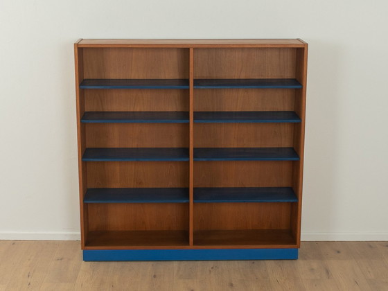 Bibliothèque classique des années 1960. Corpus de haute qualité en placage de teck avec dix étagères teintées en bleu et une nouvelle base teintée en bleu. Ref 2302083