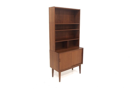 Bibliothèque en teck produite en Suède dans les années 1960. En très bon état, stable avec de minimes traces d'usures. Piètement en hêtre. À noter une très légère décoloration sur l'un des montants. Conforme à l'état vintage. Meuble en 2 parties. 28850