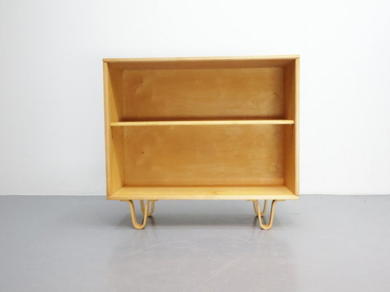 Cette bibliothèque appartient à la série en bouleau et se distingue par ses pieds en boucle caractéristiques.