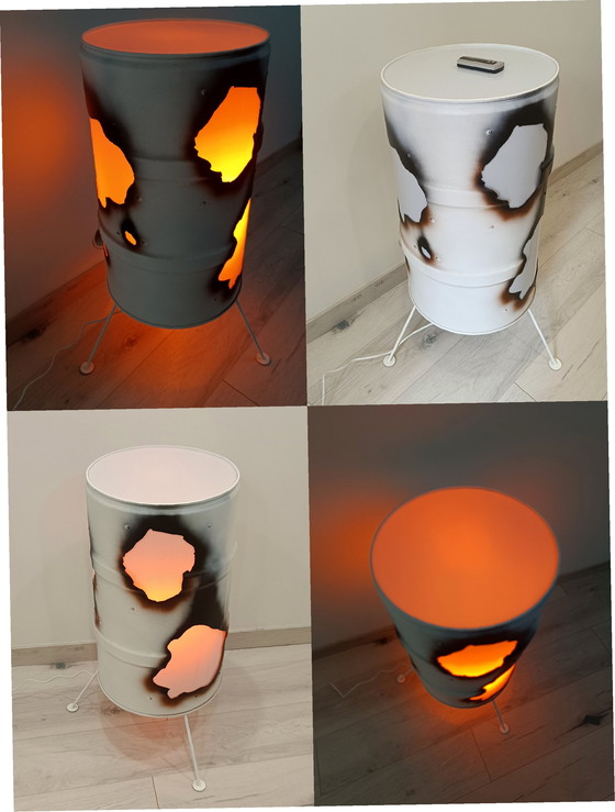 Objet lumineux sculptural fabriqué à partir d'un baril de pétrole en métal récupéré. Ce prototype unique allie l'aspect brut de l'industrie à une forte présence totémique. La lumière s'échappe à la fois par le haut - à travers un couvercle en plastique translucide reposant directement sur le bord intérieur - et par les ouvertures latérales qui ont été découpées à la main et recouvertes de plexiglas translucide.